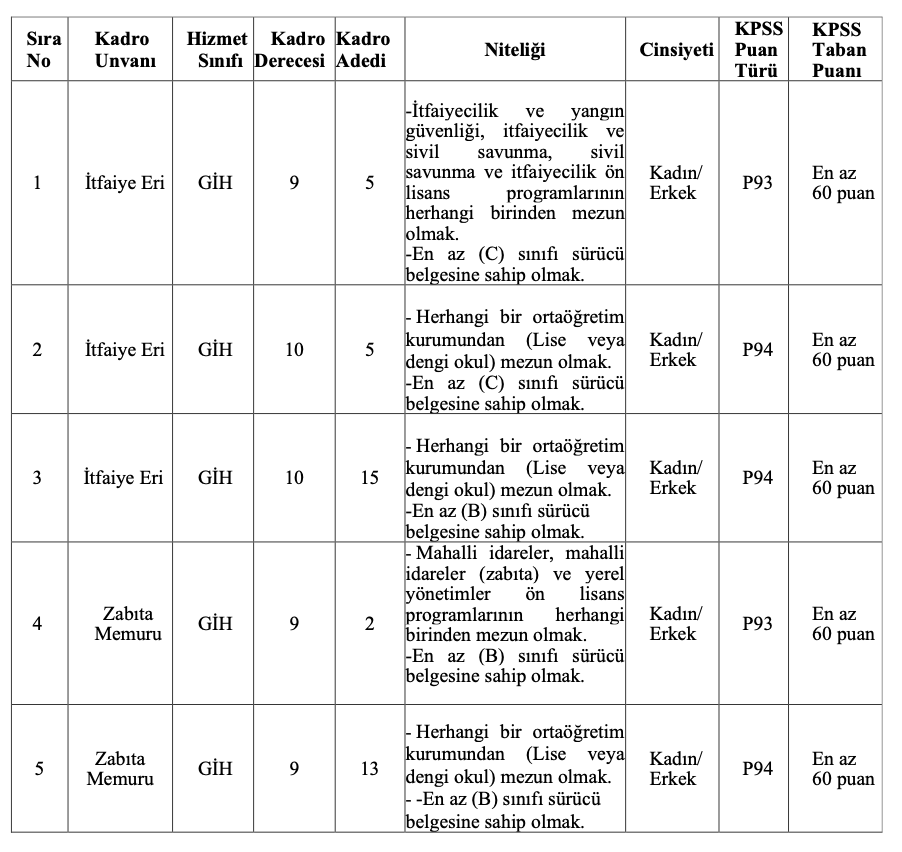 5 kişi: Ön lisans mezunu (İtfaiyecilik ve Yangın Güvenliği vb.), en az C sınıfı ehliyetli, KPSS P93 en az 60 puan.