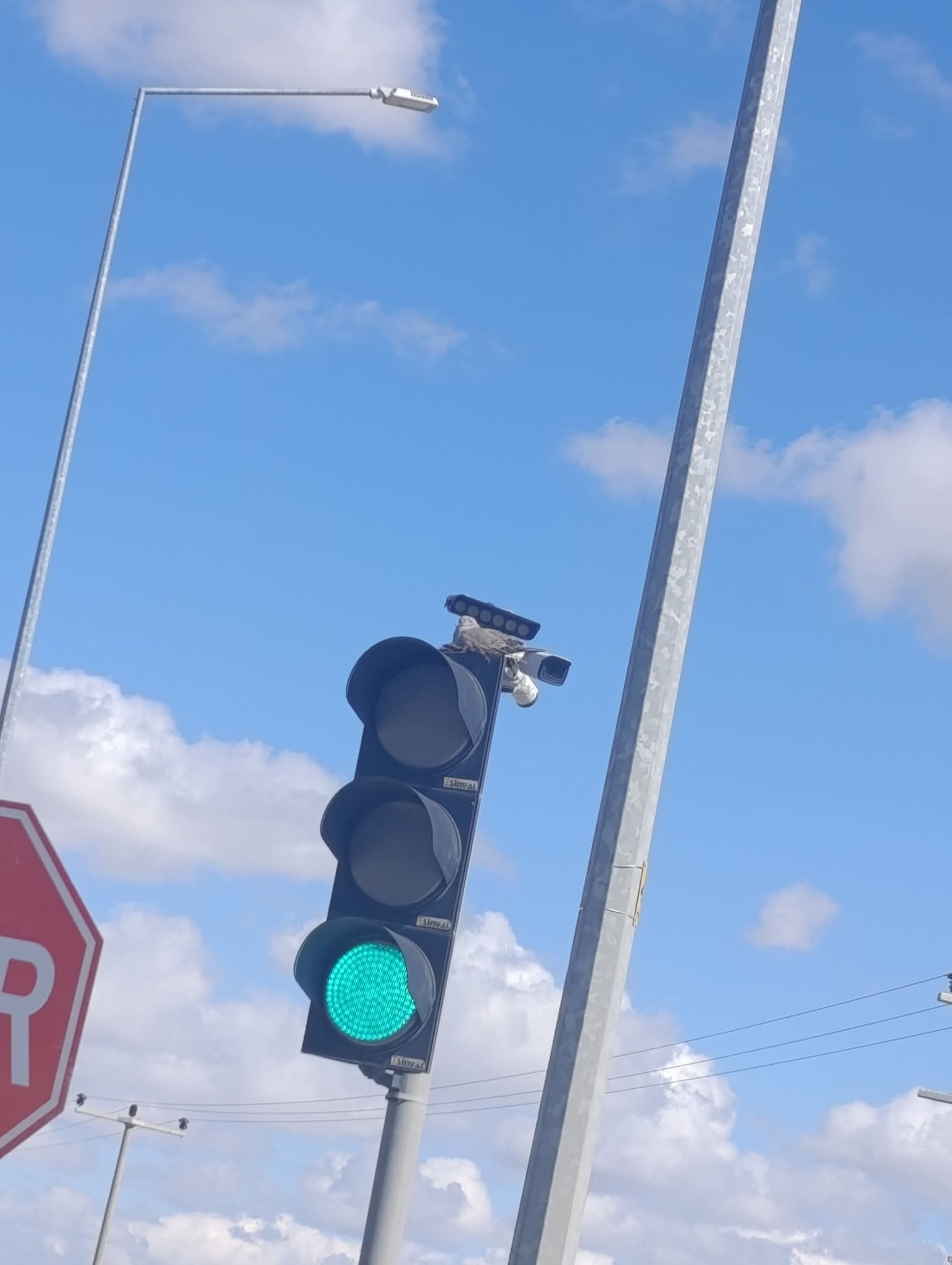 Aksaray’ın Eskil ilçesine bağlı Bozcamahmut Yaylası’nda, Konya–Aksaray karayolu üzerindeki kavşakta bulunan trafik lambalarına kumru yuva yaptı.