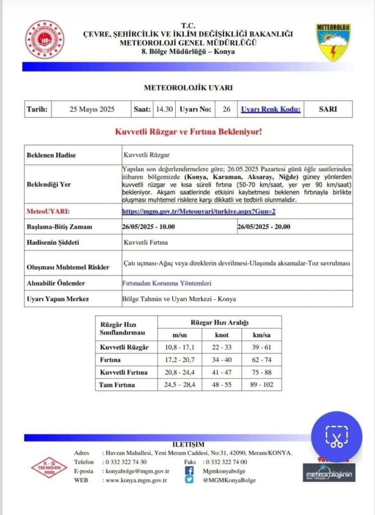 Meteoroloji 8. Bölge Müdürlüğü, 26 Mayıs 2025 Pazartesi günü Konya, Karaman, Aksaray ve Niğde’de kuvvetli rüzgar ve kısa süreli fırtına beklendiğini duyurdu. Güney yönlerden esecek rüzgarın saatte 70 ila 90 km hızla etkili olabileceği bildirildi.