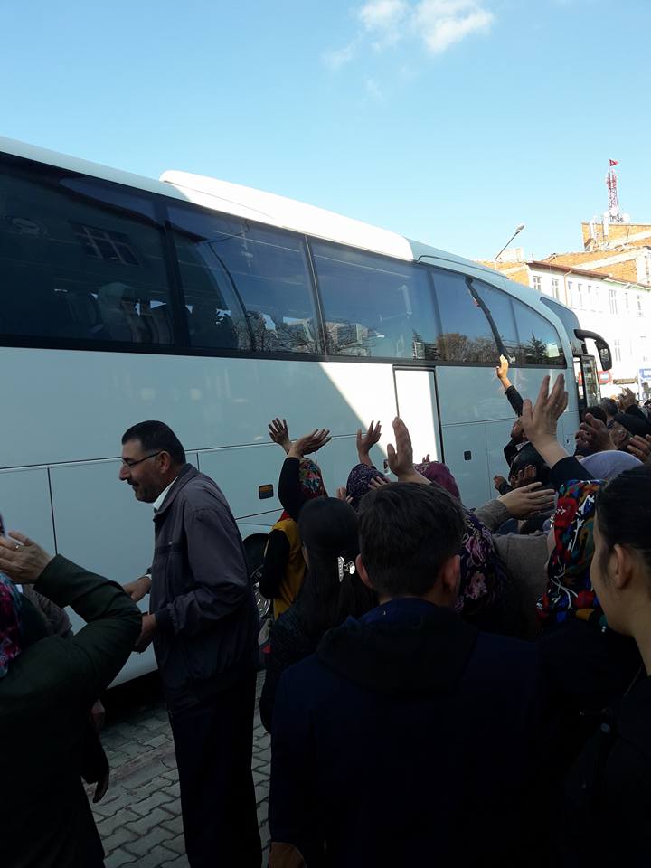 Kafiledekiler okunan dua ve ilahilerin ardından yakınlarıyla vedalaşarak Konya havalimanına gitmek üzere ilçeden ayrıldılar.