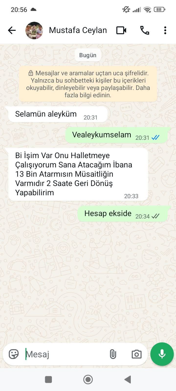Rehberimdeki herkese WhatsApp üzerinden “13.000 lira para gönderir misin, 2 saat sonra dönerim.” şeklinde mesaj atılmış. İnşallah atan olmamıştır. Yaşanan bu talihsizlikten dolayı mesaj giden herkesten özür diliyorum.